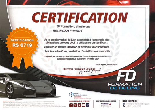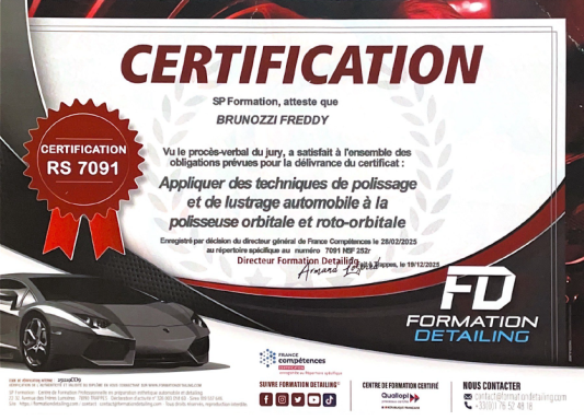 Découvrez ci-dessous mes certifications de formations professionnelles enregistrées au répertoire France compétences et suivies dans un centre de formation réputé et spécialisé dans l'esthétique automobile.