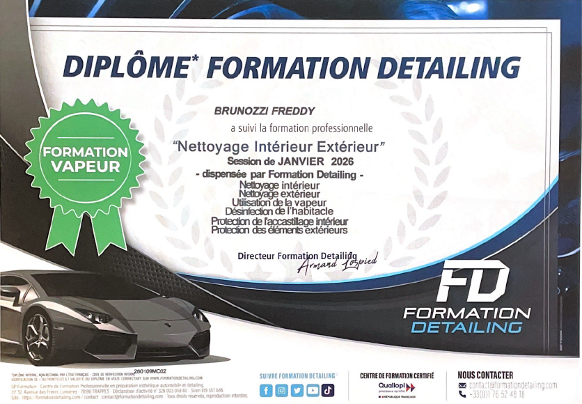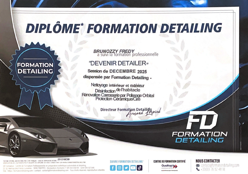 Découvrez ci-dessous mes certifications de formations professionnelles enregistrées au répertoire France compétences et suivies dans un centre de formation réputé et spécialisé dans l'esthétique automobile.